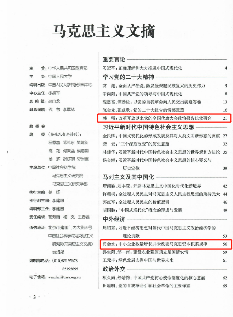 日前,买球官网韩强、尚会永两位教授文章《改革开放以来党的全国代表大会政治报告比较研究》《中小企业数量增长并未改变马克思资本积累规律》被人大复印资料《马克思主义文摘》(2023年第2期)全文转载。
