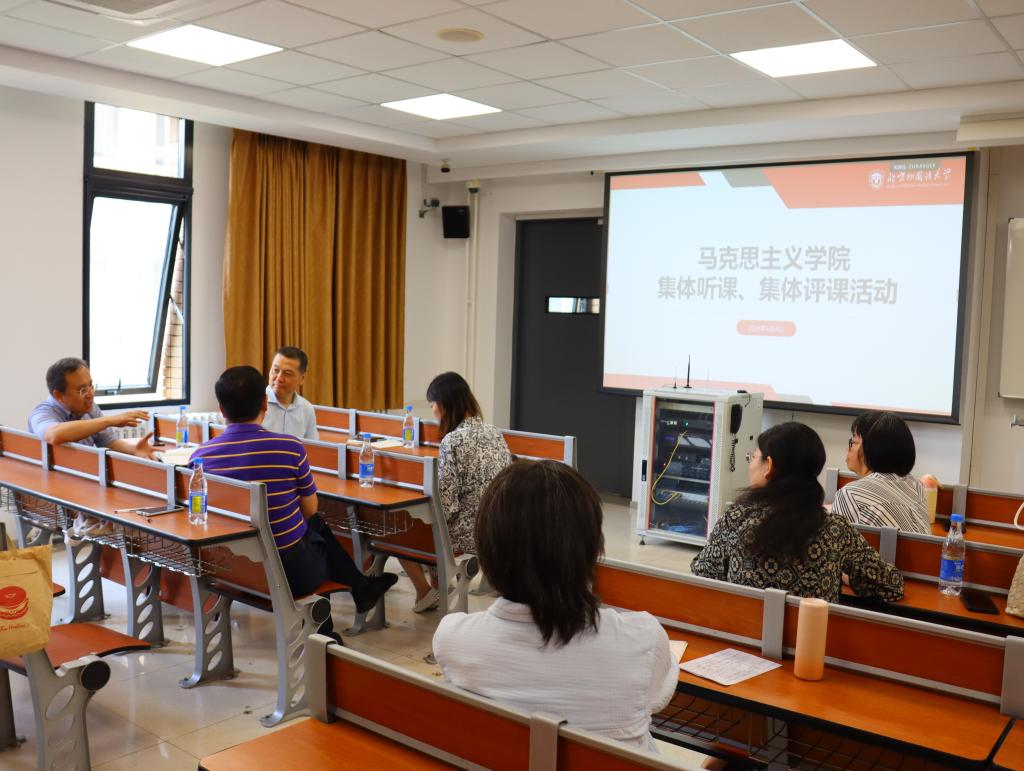 活动伊始,全体人员在现场听取了左高山教授为本科生讲授的《毛泽东思想和中国特色社会主义理论体系概论》课程。课程结束后,大家在现场进行了集体评课。贾德忠教授点评左高山教授的授课备课充分、逻辑严密、案例丰富,贴近学生实际,有机融入了习近平新时代中国特色社会主义思想的内容和实践,是一堂很好的示范课。韩强教授认为,左高山教授的课程理论性强,对提升教研室教师集体备课质量具有带动作用。听课教师依次发言,交流听课收获,提出改进建议,分享同上一堂课的体会和经验。