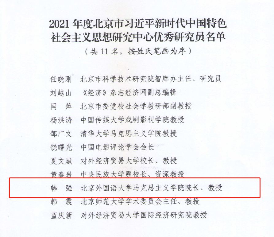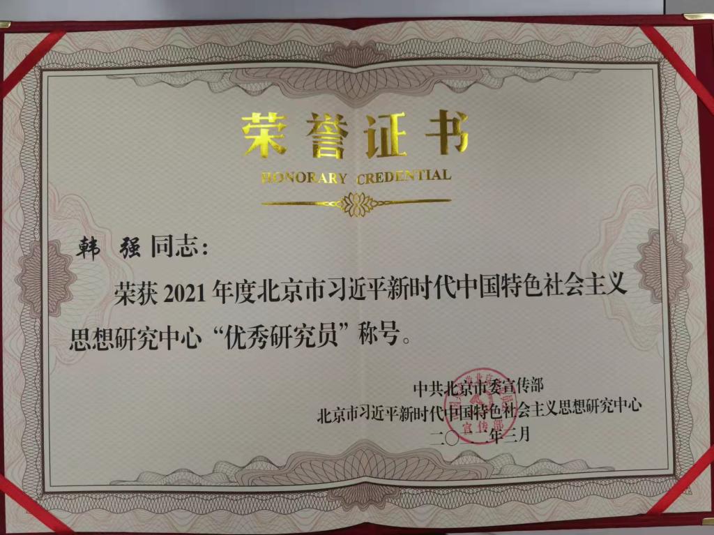 3月24日,北京市习近平新时代中国特色社会主义思想研究中心召开2021年工作总结暨2022年工作部署会,会议通报了2021年度北京市习近平新时代中国特色社会主义思想研究中心研究基地工作情况,并评选了2021年度北京市习近平新时代中国特色社会主义思想研究中心优秀研究员、优秀工作者和优秀研究基地,买球官网韩强教授获评2021年度北京市习近平新时代中国特色社会主义思想研究中心优秀研究员。