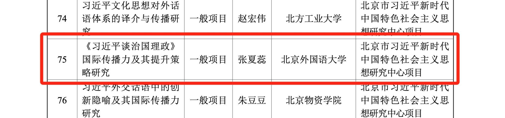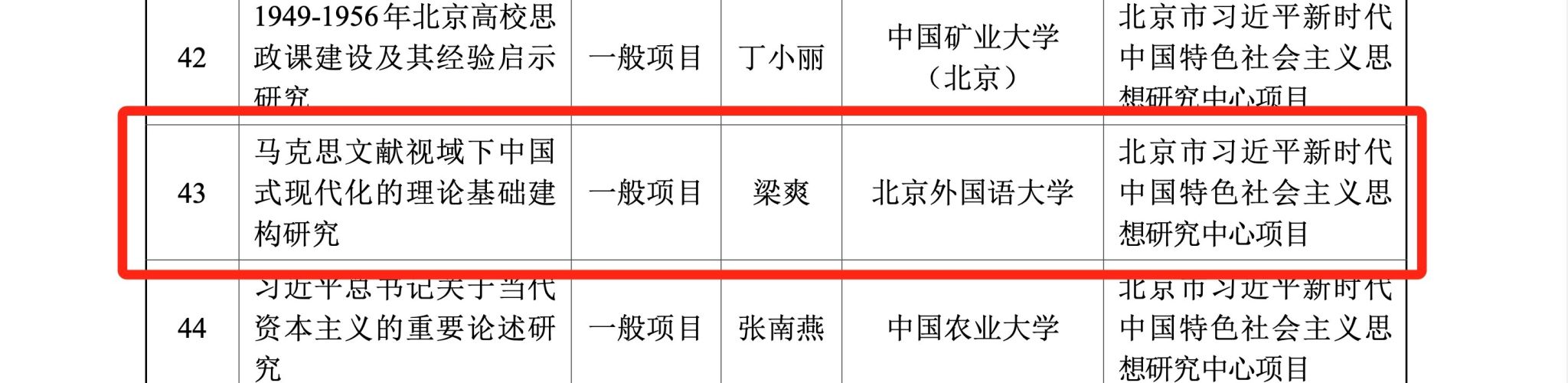 近日,北京市社会科学界联合会、北京市哲学社会科学规划办公室对于批准立项的2024年北京市社会科学基金项目进行了公示,买球官网教师梁爽主持的“马克思文献视域下中国式现代化的理论基础建构研究”、张夏蕊主持的“《习近平谈治国理政》国际传播力及其提升策略研究”获得立项。
