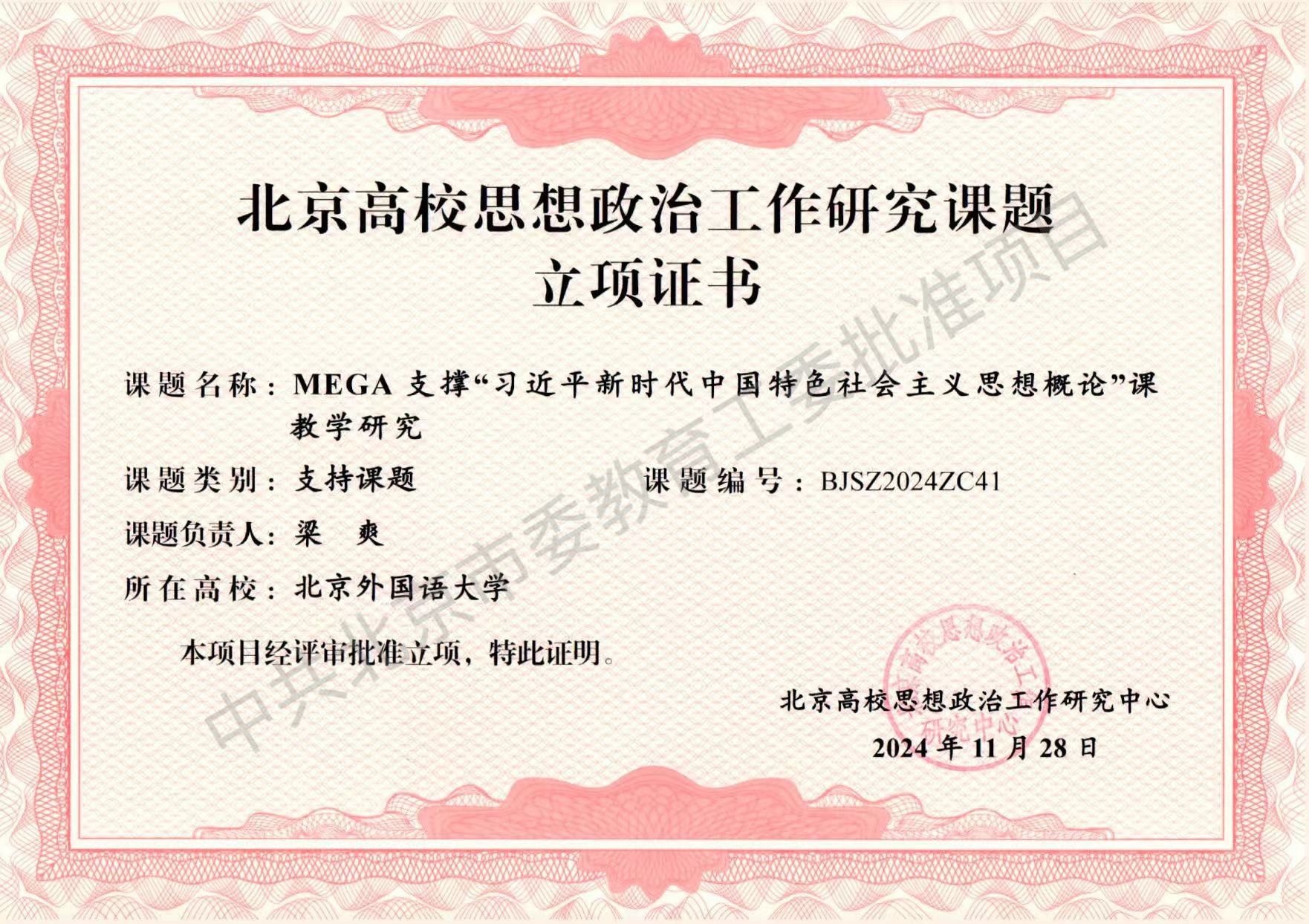 另外,在中共北京市委教育工作委员会、北京高校思想政治工作研究中心批准的2024年北京高校思想政治工作研究课题中,买球官网教师梁爽主持的“MEGA支撑‘习近平新时代中国特色社会主义思想概论’课教学研究”项目获得立项。