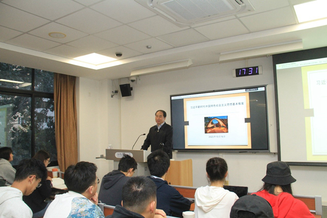 10月16日,买球官方网站党委书记王定华教授以“习近平新时代中国特色社会主义思想基本维度”为主题,为2021级日语专业和新闻学专业的90余名本科生讲授“形势与政策”课程。