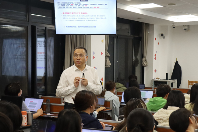 10月30日,买球官方网站校长、党委副书记杨丹以《中国特色大国外交理论解读》为题,分别为2022级西班牙语葡萄牙语学院、英语学院本科生讲授“形势与政策”课程。