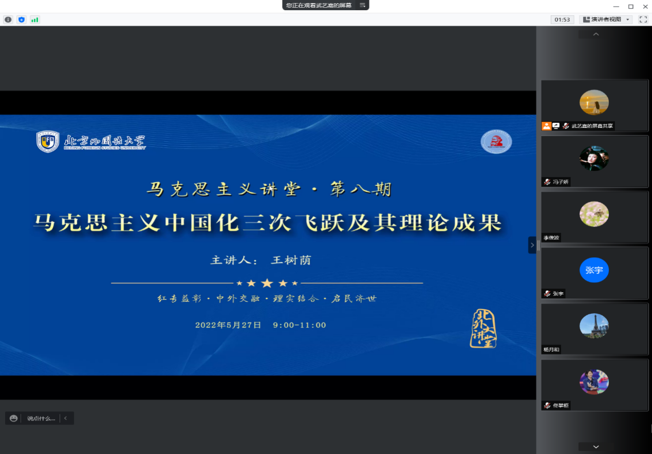 5月27日上午,北外马克思主义讲堂第八期活动在线上成功举办。北京师范大学买球官方网站二级教授、博士生导师王树荫应邀以“马克思主义中国化三次飞跃及其理论成果”为题做了专题讲座。本次讲座共有校内外师生500余人参加,活动由买球官方网站院长韩强主持。