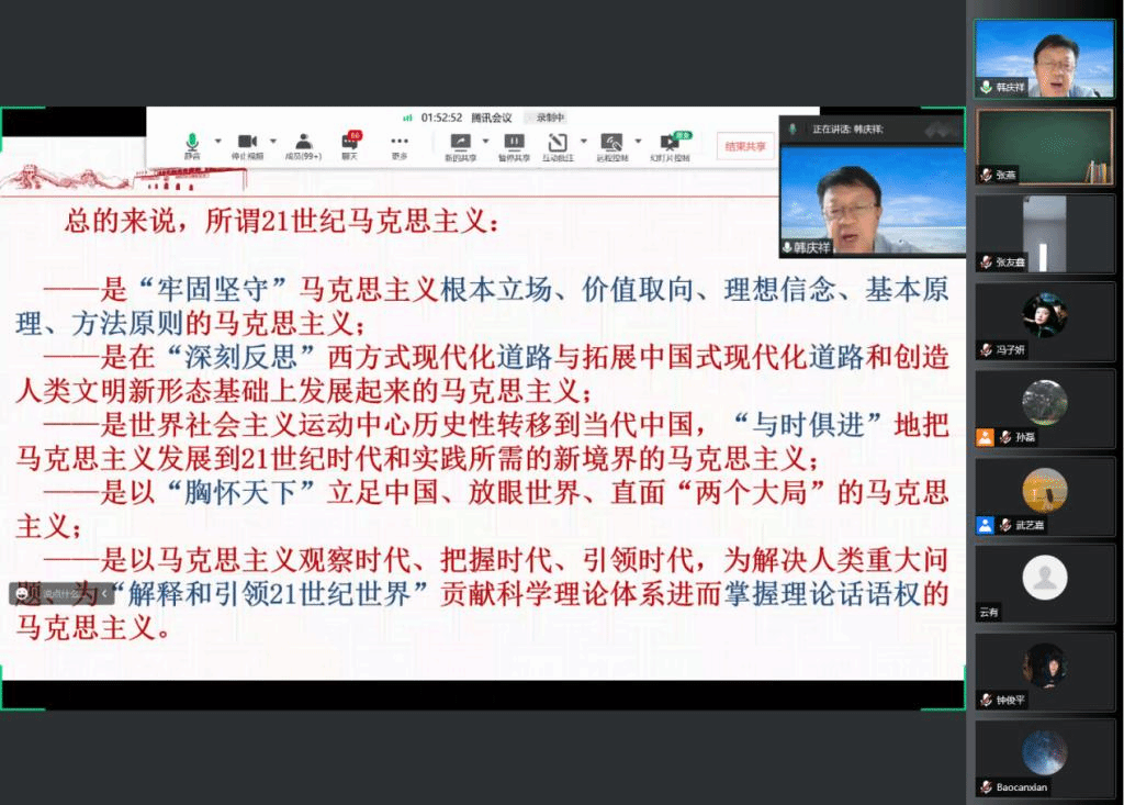 6月9号上午,北外马克思主义讲堂第九期以线上会议的形式成功举办。中央党校一级教授、中央党校专家工作组领衔专家韩庆祥教授受邀出任本次活动的主讲人,并以“21世纪马克思主义的理论阐释”为题做了报告。本次讲座由买球官方网站院长韩强教授主持,共有包括北外马院师生在内的全国高校师生300余人参会。