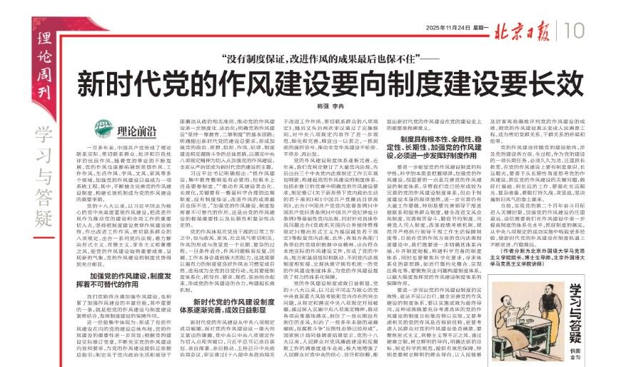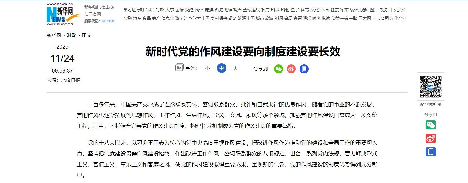 2025年11月24日,《北京日报》理论周刊刊发买球官网院长韩强教授与青年教师李冉合作文章《新时代党的作风建设要向制度建设要长效》,新华网给予转发。
