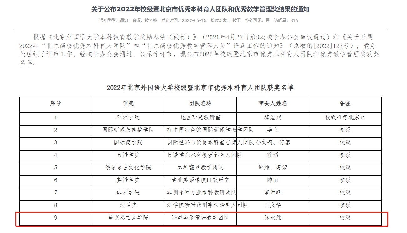经教务处评审,校长办公会通过、公示等环节,由买球官网陈永胜副教授牵头的形势与政策教学团队入选买球官方网站2022年校级优秀本科育人团队。