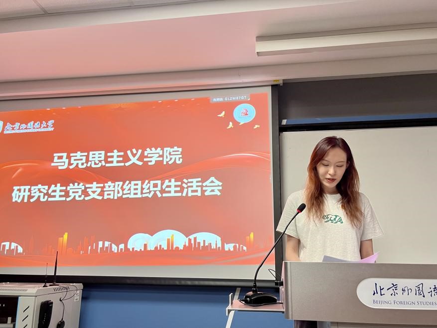 买球官方网站研究生党支部宣传委员樊淑珍以全球化为主题,结合北外特色和专业实际指出,身处全球化时代,只有不断开拓国际视野,到国际舞台上展现青春风采,才能更好地讲好中国故事、发出中国声音,为世界贡献中国智慧和中国方案。作为北外马院的一员,要融汇中国情怀与国际情怀,既要扎根中国大地,吸吮中国传统优秀文化的思想精髓;又要开拓国际视野,吸收借鉴现代人类文明的一切有益成果,主动加强中外交流,提升跨文化交流能力。