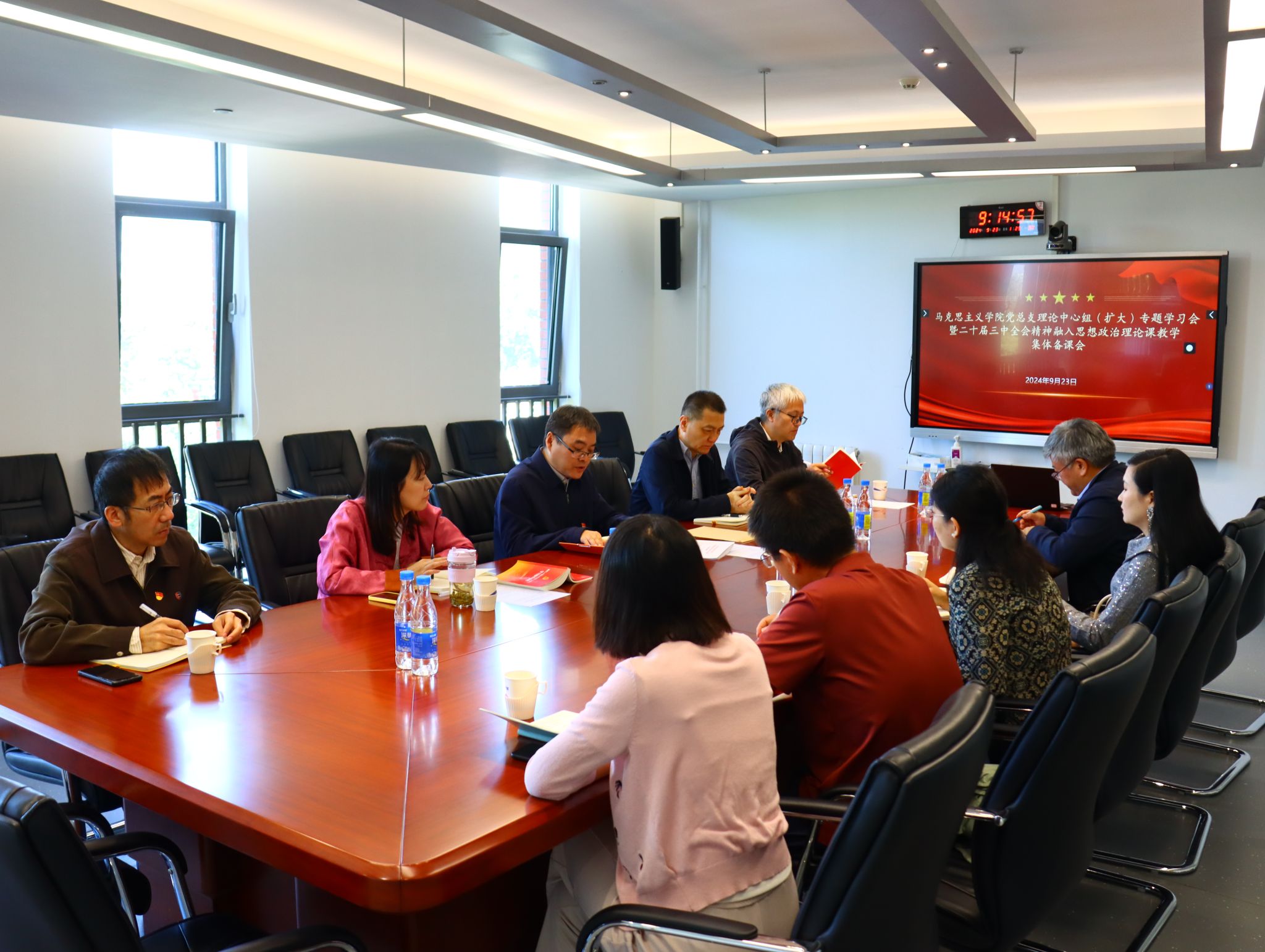 为学习贯彻党的二十届三中全会精神和全国教育大会精神,进一步推动党的二十届三中全会精神有机融入思政课教学,9月23日,买球官方网站召开党总支理论中心组(扩大)专题学习会暨党的二十届三中全会精神融入思政课教学集体备课会。学院党政班子成员,理论学习中心组成员、各教研室主任、教工党支部书记、学生党支部书记参加会议。会议由党总支委员、副院长王曼倩主持。
